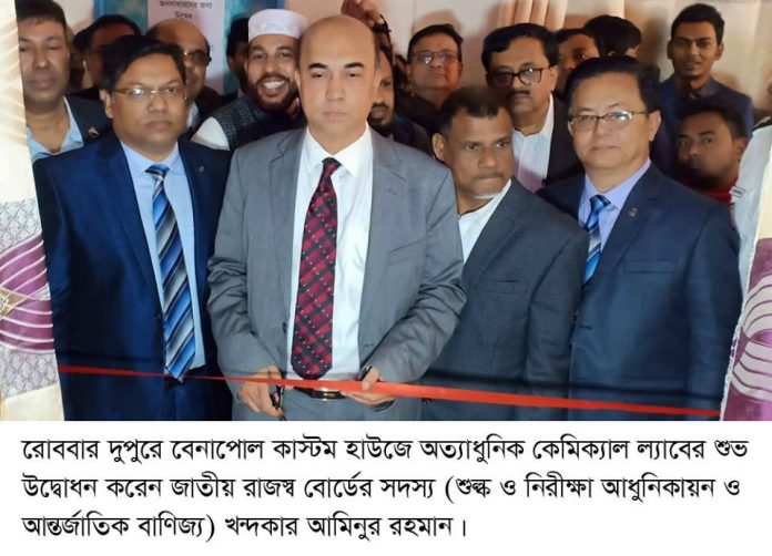 বেনাপোল স্থলবন্দর দিয়ে বৈধপথে আমদানি-রপ্তানি বাণিজ্যের সঙ্গে অবৈধ পণ্য পাচার প্রতিরোধে কাষ্টম হাউজ বেনাপোলে বিভিন্ন পণ্যের রাসায়নিক পরীক্ষার অত্যাধুনিক কেমিক্যাল ল্যাব উদ্বোধন করা হয়েছে।রবিবার দুপুরে জাতীয় রাজস্ব বোর্ডের সদস্য (শুল্ক ও নিরীক্ষা আধুনিকায়ন ও আন্তর্জাতিক বাণিজ্য) খন্দকার আমিনুর রহমান ফিতা কেটে বেনাপোল কেমিক্যাল ল্যাব উদ্বোধন করেন। এ উপলক্ষে বেনাপোল কাষ্টমস হাউজের অফিসার্স ক্লাবে কাস্টমস কর্মকর্তা, সিএন্ডএফ এজেন্টস, ব্যবসায়ীদের সাথে এক আলোচনা সভা অনুষ্ঠিত হয়। কাস্টমস কমিশনার মোহাম্মদ বেলাল হোসাইন চৌধুরীর সভাপতিত্বে বেনাপোল কাষ্টমস হাউজের অফিসার্স ক্লাবে আলোচনা সভায় প্রধান অতিথির বক্তব্য রাখেন জাতীয় রাজস্ব বোর্ডের সদস্য খন্দকার আমিনুর রহমান। সভায় অন্যান্যদের মধ্যে বক্তব্য রাখেন, বেনাপোল কাস্টম হাউজের যুগ্ম কমিশনার শাকিলা পারভিন,শহিদুল ইসলাম, ডেপুটি কমিশনার পারভেজ রেজা, বেনাপোল সিএন্ডএফ এজেন্টস এসোসিয়েশনের সভাপতি মফিজুর রহমান সজন, সাধারন সম্পাদক এমদাদুল হক লতা, সিএন্ডএফ ব্যবসায়ী আব্দুল লতিফ, ভারত-বাংলাদেশ চেম্বার অব কমার্সের স্থলবন্দর সাব কমিটির চেয়ারম্যান মতিয়ার রহমান প্রমুখ। এ সময় উপস্থিত ছিলেন, বেনাপোল স্থলবন্দর পরিচালক (ট্রাফিক) প্রদোষ কান্তি দাস, বেনাপোল কাস্টম হাউজের অতিরিক্ত কমিশনার জাকির হোসেন, ডেপুটি কমিশনার জাকির হোসেন, বেনাপোল সিএন্ডএফ এজেন্ট এসোসিয়েশনের সাবেক সভাপতি আলহাজ্ব শামসুর রহমান, সিনিয়র সহ-সভাপতি আলহাজ্ব নুরুজ্জামান, যুগ্ম সম্পাদক মহসিন মিলন, জামাল হোসেন, কাস্টমস বিষয়ক সম্পাদক নাসির উদ্দিন প্রমূখ। সভায় প্রধান অতিথি কিভাবে সরকারের রাজস্ব বাড়ানো ও কাস্টমস হাউজের উন্নয়ন করা যায় সে বিষয়ে দিক নির্দেশনামুলক বক্তব্য প্রদান এবং আগামীতে কাস্টমসের নানা পরিকল্পনার কথাও জানান। বিগত বছর গুলোর তুলনায় এ স্থলবন্দরের আমূল পরিবর্তন, উন্নয়ন, সামাজিক ও মানবিক কার্যক্রম, নিলাম টেন্ডার পদ্ধতিতে সচ্ছতা আনায়ন করায় ধন্যবাদ জ্ঞাপন করেন কাস্টম কমিশনার বেলাল হোসাইন চৌধুরীকে। তিনি বেনাপোল কাস্টম হাউজকে একটি মডেল হিসেবে তুলনা করেন। পরে তিনি বন্দরে স্থাপিত স্ক্যানিং মেশিন ও বন্দরের বিভিন্ন স্থানে ঘুরে ঘুরে সন্দেহ ভাজন পণ্যবাহী ট্রাক স্ক্যানার পর্যবেক্ষণ, কাস্টমস, ইন্টিগেটেড চেকপোস্ট ও ইমিগ্রেশনের কার্যক্রম পরিদর্শন করেন।