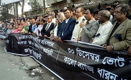 মানববন্ধনে বক্তারা একাদশ সংসদ নির্বাচনের আগের রাতেই আইনশৃঙ্খলা বাহিনী ও নির্বাচন সংশ্লিষ্টদের সহায়তায় ব্যালট বাক্স ভরে রাখার অভিযোগ করে অবিলম্বে নতুন নির্বাচন দাবি করেন। দেশের মানুষ নির্বাচন মেনে নেয়নি দাবি করে নেতারা বলেন, প্রহসনের এই নির্বাচন জাতির জন্য একটি কলঙ্ক হয়ে থাকবে।