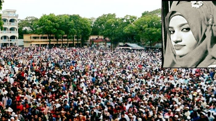 নুসরাতের বাড়ি থেকে দেড় কিলোমিটার দূরে বিদ্যালয় মাঠে লাশ আনা হয় বিকেলে। সেখানে বক্তব্য দেন সাংসদ মাসুদ উদ্দিন চৌধুরীর পক্ষে তাঁর ভাই সাইফুদ্দিন চৌধুরী, আওয়ামী লীগ নেতা আলাউদ্দিন আহমেদ চৌধুরী, জেলা প্রশাসক মো. ওয়াহিদুজজামান, পুলিশ সুপার এস এম জাহাঙ্গীর আলম সরকার, জেলা আওয়ামী লীগের সভাপতি আবদুর রহমান, উপজেলা চেয়ারম্যান জহির উদ্দিন মাহমুদ প্রমুখ। সবাই নুসরাতের খুনিদের আইনের আওতায় এনে শাস্তির প্রতিশ্রুতি দেন।