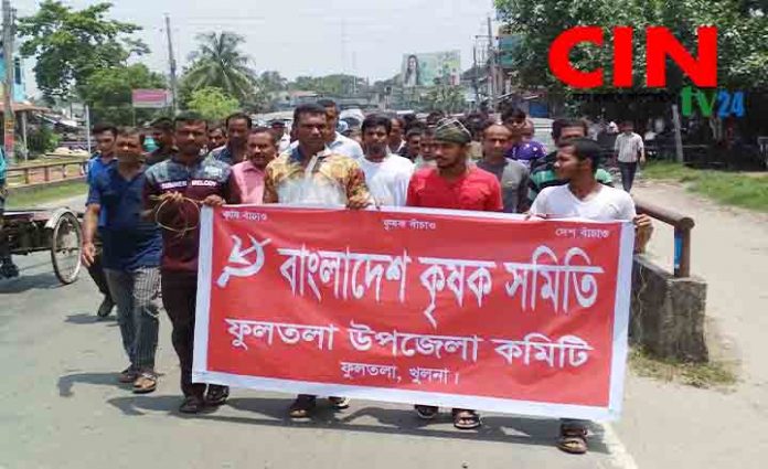 ফুলতলা থানা প্রতিনিধি : বুধবার সকাল ১১ টায় বাংলাদেশ কৃষক সমিতির ফুলতলা উপজেলা কমিটি গনপ্রজাতন্ত্রী বাংলাদেশ সরকারের ভূমি ও কৃষি মন্ত্রাণালয় কতৃক গেজেট আকারে প্রকাশিত প্রঙ্গাপনের দ্রুত বাস্তবায়নের দাবিতে ফুলতলা উপজেলা সভাপতি শেখ দিদারুল ইসলাম এর সভাপতিত্বে কৃষক সমিতির ফুলতলা উপজেলা কার্যালয়ে অনুষ্ঠিত হয়। উক্ত সভায় আলোচনা হয় কৃষকের ২৫ বিঘা পর্যন্ত জমির খাজনা মওকুফ ও সরকার নিধারিত ১০৪০ টাকা মণ ধরে প্রকৃত কৃষকদের নিকট হইতে উপজেলা খাদ্য অধিদপ্তরের মাধ্যমে ক্রয়ের দাবিতে উপজেলা নির্বাহী কর্মকতা ভূমি কমকতা ও কৃষি কমকতার নিকট সরকারি গেজেট ও প্রকৃত কৃষকদের নামের তালিকা প্রদান করা হয়। আলোচনা শেষে ফুলতলা উপজেলার কৃষক সমিতির অফিস থেকে একটি রেলি বের হয়ে উপজেলায় গিয়ে শেষ হয়। সভায় উপস্থিত ছিলেন কৃষক সমিতির কেন্দ্রীয় সদস্য অরুনা চৌধুরী, জেলা সদস্য শিশির সরকার, বৈদ্যনাথ বিশ্বাস, ও উপজেলা সম্পাদক ইসতেখার রোজার, সদস্য গাজী আফজাল, রেজাউল করিম, খন্দকার মনিরুজ্জামান,নিতিশ বিশ্বাস, প্রনব হালদার, বিদ্যুৎ মন্ডল, সন্দিপন মন্ডল, অমলেশ হালদারসহ বিভিন্ন ব্যক্তি বগ উপস্থিত ছিলেন। বক্তরা বলেন, অনতিবিলম্বে সরকারী নিদেশ মোতাবেক উপজেলা সদরে ধান ক্রয় কেন্দ্র, ধান ক্রয় সহ, ভূমি অফিসের সকল দূনীতি বন্ধ পূবক বিধি মোতাবেক কার্য্য সম্পাদনের দাবি জানান তারা।