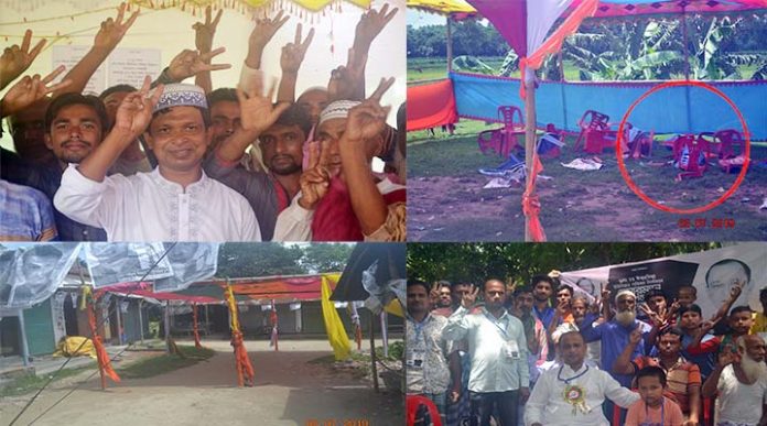 সরেজমিনে ইউনিয়নের শহিদ মুক্তিযোদ্ধা বাজারে গিয়ে দেখা যায় সেখানে আনারস প্রতীক নিয়ে চেয়ারম্যান পদে সতন্ত্র প্রার্থী ফারুকুল আহমেদ রতন এর নির্বাচনী ক্যাম্প ভেঙ্গে ফেলা হয়েছে। এ বিষয়ে সতন্ত্র প্রার্থী ফারুকুল আহমেদ রতন সি আই এন টিভি ২৪ কে বলেন, আমি এবং আমার কর্মী সকলেই এখন আতংকে রয়েছেন। আমি বর্তমানে নিরাপত্তাহীনতায় ভুগছি। আমি এবং আমার কর্মী ঠিকমত উঠান বৈঠক পর্যন্ত করতে পারছি না। আমি এই ইউনিয়ন আওয়ামীলীগের আহ্বায়ক। তিনি ( আওয়ামীলীগ মনোনীত প্রার্থী) তৃনমূল এবং ত্যাগী নেতাদের মূল্যায়ন না করে জামায়াত সন্ত্রাসীদের নিয়ে নির্বাচন করছেন যার ফলে স্থানীয় সকল আওয়ামীলীগের নেতাকর্মী আমার সাথে কাজ করছে। আওয়ামীলীগ কখনই সন্ত্রাসী কর্মকাণ্ড সমর্থন করে না। প্রশাসন এবং নির্বাচন কমিশনের নিকট আমার একটাই দাবি এইসব সন্ত্রাসীদের প্রতিহত করে একটি অবাধ সুষ্ঠু এবং নিরপেক্ষ নির্বাচনের ব্যবস্থা করুন যাতে জনগন ভোট উৎসবে অংশগ্রহন করতে পারে।