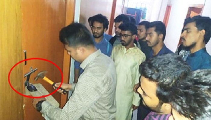 তালা ভেঙ্গে কক্ষে প্রবেশ করেছেন ডাকসু ভিপি নুরুল হক নুর। একটি ফোনালাপ ফাঁসের পর তার বিরুদ্ধে অনাস্থা জানিয়ে দুপুরে কক্ষে তালা লাগিয়ে দেন ‘মুক্তিযুদ্ধ মঞ্চে’র একাংশের নেতাকর্মীরা। নুরের কুশপুত্তলিকাও দাহ করেন তারা। এদিকে বিকাল পাঁচটার দিকে প্রশাসনের পক্ষ থেকে সহায়তা না পেয়ে শিক্ষার্থীদের সঙ্গে নিয়ে তালা ভেঙে কক্ষে প্রবেশ করেন ডাকসু ভিপি। সন্ধ্যায় বাংলাদেশ সাধারণ ছাত্র অধিকার পরিষদের যুগ্ম আহবায়ক মো. রাশেদ খান জানান, প্রক্টরকে তালা খুলে দেয়ার জন্য তার অফিসে গেলে তিনি ভিপি ও আমাদের সাথে অশোভন আচরণ করেন। এমনকি আমরা বিশ্ববিদ্যালয়ের নিয়মিত ছাত্র হওয়ার পরেও আমাদের অছাত্র বলে আখ্যায়িত করেন। প্রশাসনের কাছে তালাবদ্ধ কক্ষে প্রবেশে সহায়তা চাওয়ার পরেও কোন সহায়তা না পেয়ে ভিপি সাধারণ শিক্ষার্থীদের সাথে নিয়ে তালা ভেঙে তার রুমে প্রবেশ করেন।