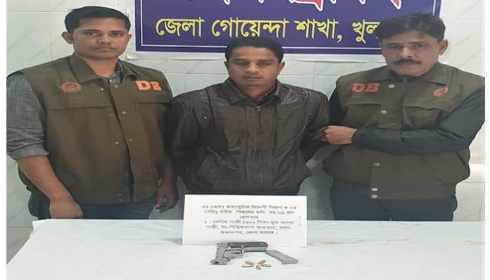 খুলনা জেলা ডিবি পুলিশের সাড়াশি অভিযানে অস্ত্রধারী সন্ত্রাসী সেলিম গাজী কে ০১ টি অত্যাধুনিক বিদেশী পিস্তল ও ০৫ রাউন্ড গুলি সহ গ্রেফতার করে।