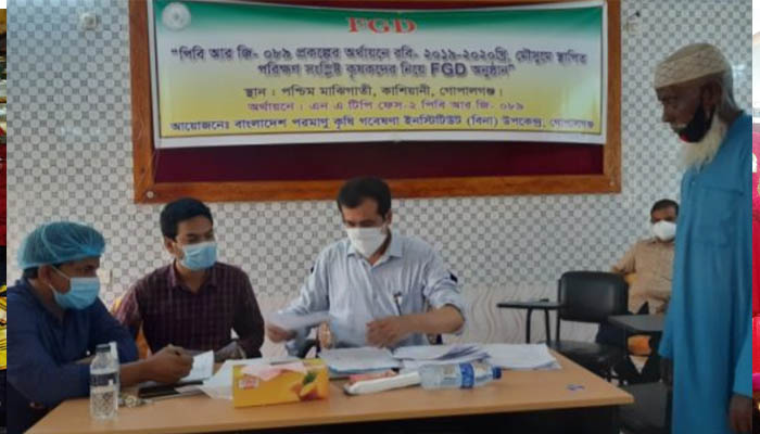 বাংলাদেশ পরমানু কৃষি গবেষণা ইনস্টিটিউটের (বিনা) পিবিআরজি -০৮৯ প্রকল্পের অর্থায়নে গোপালগঞ্জে রবি ২০১৯-২০২০ মৌসুমে স্থাপিত পরিক্ষণ সংশ্লিষ্ট কৃষকদের নিয়ে ফার্মার গ্রুপ ডিসকার্সন (এফজিডি) অনুষ্ঠিত হয়েছেন সোমবার গোপালগঞ্জ বিনা উপকেন্দের হলরুমে আয়েজিত এ অনুষ্ঠানের উদ্বোধন করেন প্রধান অতিথি বিনার কম্পোনেন্ট ২ এর প্রধান গবেষক মোঃ মহসীন আলী সরকার। অন্যান্যের মধ্যে বক্তব্য রাখেন বিনার বৈজ্ঞানিক কর্মকর্তা মোঃ রবিউল ইসলাম, সৈয়দ ইসতিয়াক আকতার, ফার্ম ম্যানেজার আলমগীর কবির সহ আরো অনেকে। এ অনুষ্ঠানে গোপালগঞ্জ জেলার ৫ উপজেলার শতাধিক কৃষক অংশ নেন।
