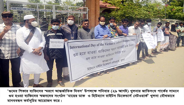 ‘গুম ও বিচারবহির্ভূত হত্যাকা-সহ সকল রাষ্ট্রীয় নিপীড়ন বন্ধ কর!’ শীর্ষক প্রতিপাদ্যকে সামনে রেখে গুম হওয়া ব্যক্তিদের স্বজনদের সংগঠন ‘মায়ের ডাক ও হিউম্যান রাইটস ডিফেন্ডার্স নেটওয়ার্ক’ খুলনা যৌথভাবে এ কর্মসূচির আয়োজন করে।
