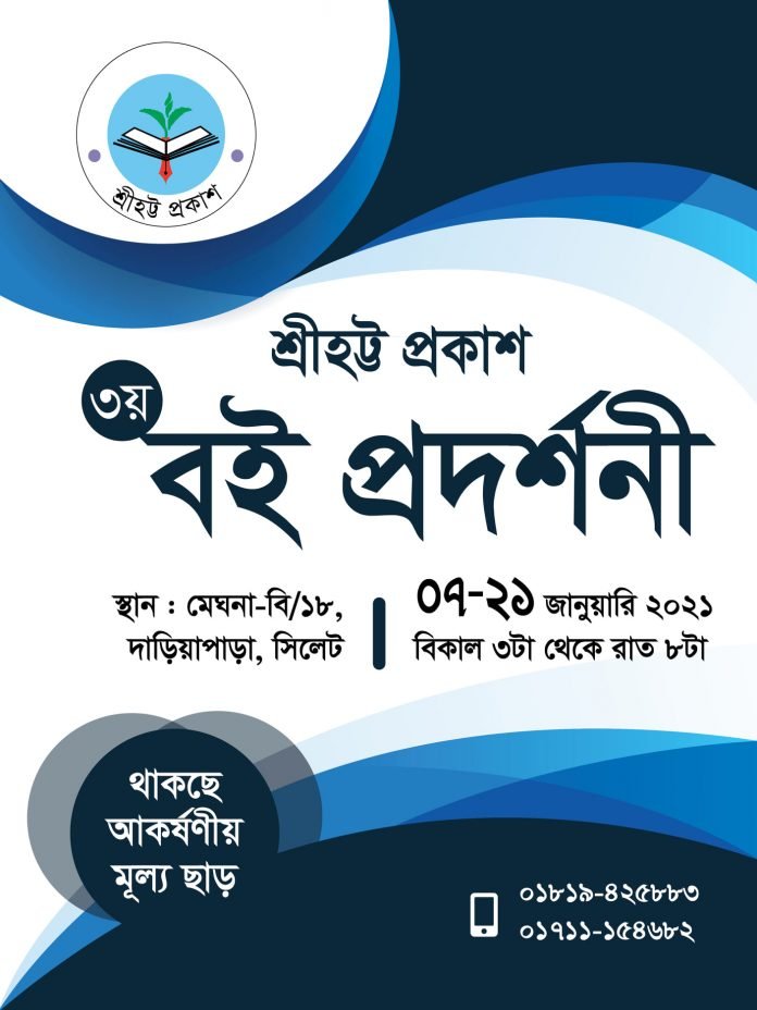 শ্রীহট্ট প্রকাশ-এর উদ্যোগে ৩য় বারের মতো বই প্রদর্শনীর আয়োজন করা হয়েছে। আগামী ৭ জানুয়ারি থেকে ২১ জানুয়ারি ২০২১ শ্রীহট্ট প্রকাশ-এর স্থায়ী অফিস মেঘনা-বি/১৮, দাড়িয়াপাড়া, সিলেট-এ শ্রীহট্ট প্রকাশ ৩য় বই প্রদর্শনী অনুষ্ঠিত হবে। বই প্রদশর্নীতে ক্রেতারা বিশেষছাড়ে হজরত মুহম্মদ (সা.)/মুক্তিযুদ্ধ/মওলানা ভাসানী/বঙ্গবন্ধু শেখ মুজিবুর রহমান/নাস্তিক-আস্তিক/বিশ্ব কবি রবীন্দ্রনাথ ঠাকুর/ভারতের ইতিহাস কাঁপানো ঝান্সী রানি/পবিত্র হজ/কবিতা/সাইন্স ফিকশন/প্রবন্ধ/নারী/সামাজিক সমস্যা/ সালমান শাহ/সংস্কৃতি/গান/রাজনীতি/ইতিহাস/ শিশুতোষ/ছড়া/ গল্প/ রহস্য/সংস্কৃতি/রম্য প্রভৃতি বই ক্রয় করতে পারবেন। প্রতিদিন দুপুর ৩ টা হতে রাত ৮ টা পর্যন্ত শ্রীহট্ট প্রকাশ বই প্রদর্শনী অনুষ্ঠিত হবে।