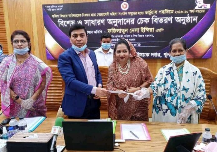 মঙ্গলবার দুপুরে ২০১৯-২০২০ অর্থ বছরের মহিলা বিষয়ক অধিদপ্তরের নিবন্ধনপ্রাপ্ত স্বেচ্ছাসেবী মহিলা সংগঠনগুলোর মাঝে বিশেষ ও সাধারণ অনুদানের চেক বিতরণ করা হয়। ভার্চুয়াল পদ্ধতিতে খুলনা জেলা প্রশাসকের সম্মেলনকক্ষ হতে অনুষ্ঠিত হয়। মহিলা ও শিশু বিষয়ক মন্ত্রণালয়ের প্রতিমন্ত্রী ফজিলাতুন নেসা ইন্দিরা অনুষ্ঠানে প্রধান অতিথি হিসেবে ঢাকা হতে অনলাইনে যুক্ত হন। প্রধান অতিথির বক্তৃতায় প্রতিমন্ত্রী বলেন, নারী ক্ষমতায়ন ও নারী শিক্ষার উন্নয়নের প্রধানমন্ত্রী শেখ হাসিনার অবদান আজ বিশ্বের কাছে রোল মডেল। জাতির পিতা বঙ্গবন্ধু শেখ মুজিবুর রহমান সমবায়ের ওপর গুরুত্বারোপ করেছিলেন। নারীমুক্তি ও নারীর ক্ষমতায়নে তাঁর অবদান অশেষ। বঙ্গবন্ধু ১৯৭২ সালে নারী পুনর্বাসন বোর্ড গঠন করেন। অনুষ্ঠানে খুলনা সিটি কর্পোরেশন ও খুলনা জেলার নয়টি উপজেলার ৭৫টি স্বেচ্ছাসেবী মহিলা সংগঠনের মাঝে মোট ২৩ লাখ ১০ হাজার টাকার অনুদানের চেক বিতরণ করা হয়। খুলনা জেলা প্রশাসন ও জেলা মহিলা বিষয়ক দপ্তর আয়োজিত এ অনুষ্ঠানে অনলাইনে ঢাকা হতে আরো যুক্ত ছিলেন মহিলা ও শিশু বিষয়ক মন্ত্রণালয়ের সচিব কাজী রওশন আক্তার, জাতীয় মহিলা সংস্থার চেয়ারম্যান চমন আরা তৈয়ব এবং মহিলা বিষয়ক অধিদপ্তরের মহাপরিচালক পারভীন আকতার। এসময় খুলনা জেলা প্রশাসকের সম্মেলনকক্ষে উপস্থিত ছিলেন জেলা প্রশাসক মোহাম্মদ হেলাল হোসেন, অতিরিক্ত জেলা প্রশাসক (সার্বিক) মোঃ ইউসুপ আলী, মহিলা বিষয়ক দপ্তরের উপপরিচালক নার্গিস ফাতেমা জামিন, খুলনা জেলা মহিলা সংস্থার চেয়ারম্যান হোসনে আরা রুনুসহ অনুদান প্রাপ্ত মহিলা সংগঠনগুলোর প্রতিনিধি, নারীনেত্রী ও সরকারি কর্মকর্তারা। একই সময়ে দেশের সকল জেলায় মহিলা বিষয়ক অধিদপ্তরের নিবন্ধনপ্রাপ্ত স্বেচ্ছাসেবী মহিলা সংগঠনগুলোর মাঝে বিশেষ ও সাধারণ অনুদানের চেক বিতরণ অনুষ্ঠিত হয়।