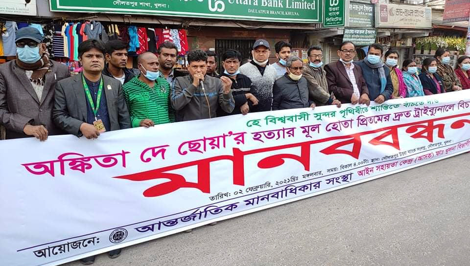 খুলনার দৌলতপুর উত্তরা ব্যাংক এর সামনে মঙ্গলবার বিকালে আন্তর্জাতিক মানবাধিকার সংস্থা আইন সহায়তা কেন্দ্র (আসক) ফাউন্ডেশন খুলনা বিভাগীয় কমিটির পক্ষ থেকে “অঙ্কিতা দে ছোয়া’র” হত্যার মূল হোতা প্রীতমের দ্রত বিচার ট্রাইব্যুনালে বিচারের দাবীতে একটি মানববন্ধন এর আয়োজন করা হয়।