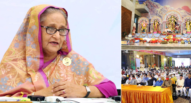 প্রধানমন্ত্রী শেখ হাসিনা বাংলাদেশকে সামপ্রদায়িক সমপ্রীতির দেশ উল্লেখ করে সবাইকে এক হয়ে চলার আহ্বান জানিয়েছেন। বলেছেন, পূজামন্ডপে অরাজকতা সৃষ্টিকারীদের সরকার আইনের আওতায় এনে দৃষ্টান্তমূলক শাস্তির ব্যবস্থা করবে। সমপ্রতি কুমিল্লার পূজামণ্ডপে সৃষ্ট গুজবকে কেন্দ্র করে মণ্ডপ ভাঙচুর এবং অরাজকতা সৃষ্টির অপচেষ্টাকারীদের বিরুদ্ধে প্রধানমন্ত্রী বলেন, যে ঘটনা ঘটেছে সঙ্গে সঙ্গেই আমরা ব্যবস্থা নিচ্ছি এবং সার্বক্ষণিক আমরা যোগাযোগ রাখছিলাম এবং এ ব্যাপারে যথাযথ পদক্ষেপ নেয়া হচ্ছে এবং যেখানে যেখানে যারাই এ ধরনের কোন ঘটনা ঘটাবে সঙ্গে সঙ্গে তাদের খুঁজে বের করা হবে। এটা আমরা অতীতেও করেছি এবং সেটা আমরা করতে পারবো। প্রধানমন্ত্রী বলেন, যথাযথ শাস্তি তাদের দিতে হবে। মানে এমন শাস্তি যেন ভবিষ্যতে আর কেউ সাহস না পায়- সেটাই আমরা চাই। গতকাল শারদীয় দুর্গাপূজা উপলক্ষে ঢাকেশ্বরী জাতীয় মন্দির কেন্দ্রীয় পূজামণ্ডপে ভক্তদের সঙ্গে শুভেচ্ছাবিনিময়কালে দেয়া ভাষণে তিনি এসব কথা বলেন। প্রধানমন্ত্রী গণভবন থেকে ভিডিও কনফারেন্সের সাহায্যে ভার্চ্যুয়ালি অনুষ্ঠানে অংশগ্রহণ করেন।